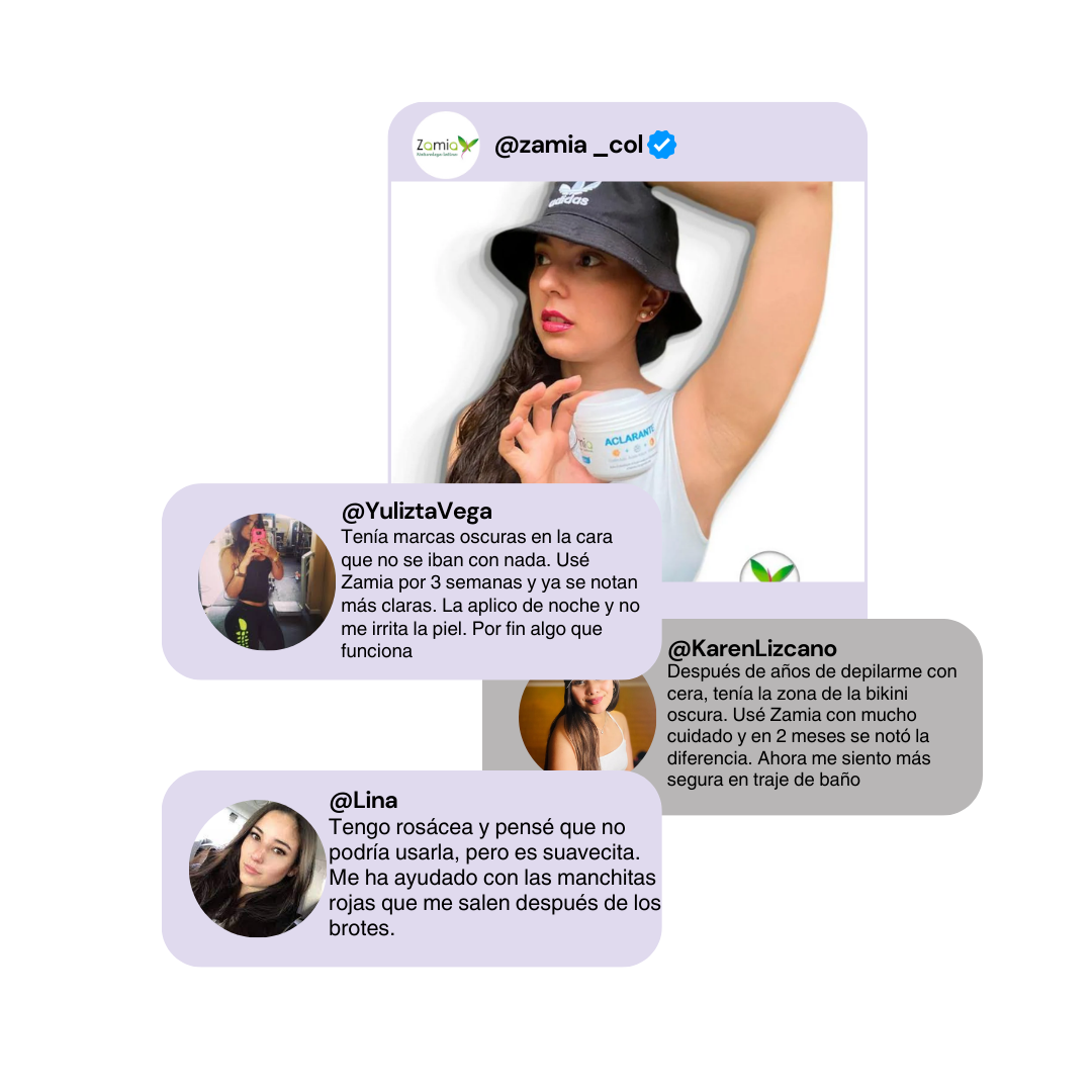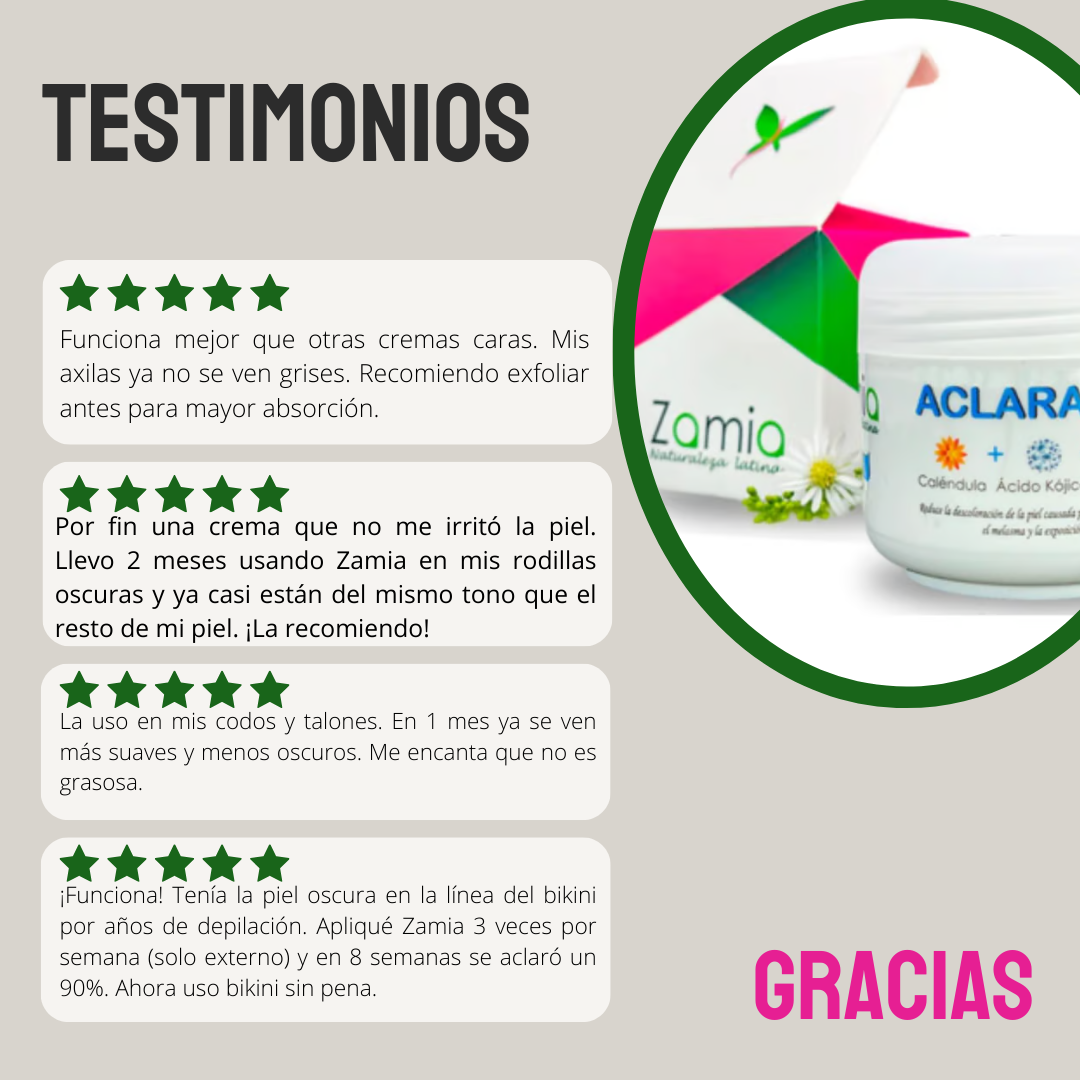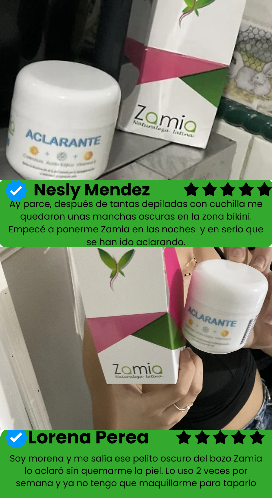 Nuestra Aclarante Zamia está diseñada específicamente para atacar esas zonas difíciles, brindándote una solución efectiva y comprobada para que te sientas segura y radiante nuevamente. ✨