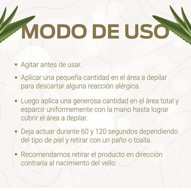 1.✅ Aplicar una pequeña cantidad en parte del área a depilar para descartar alguna reacción alérgica.